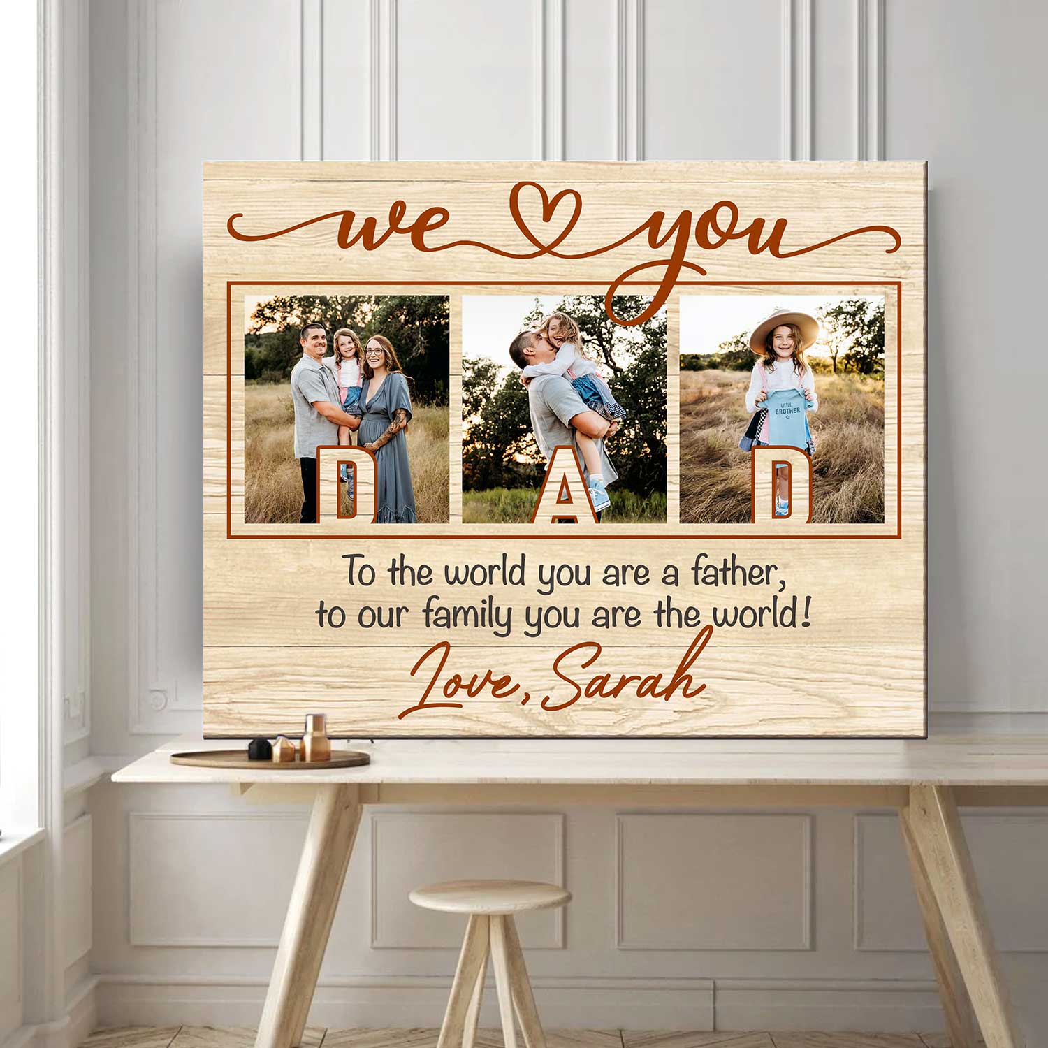 Show your appreciation for the best father in the world with our personalized photo canvas poster. Featuring the heartwarming message 'To the world you are a father, but to our family you are the World', this Father's Day gift is sure to touch his heart and remind him of his importance to his family.✨