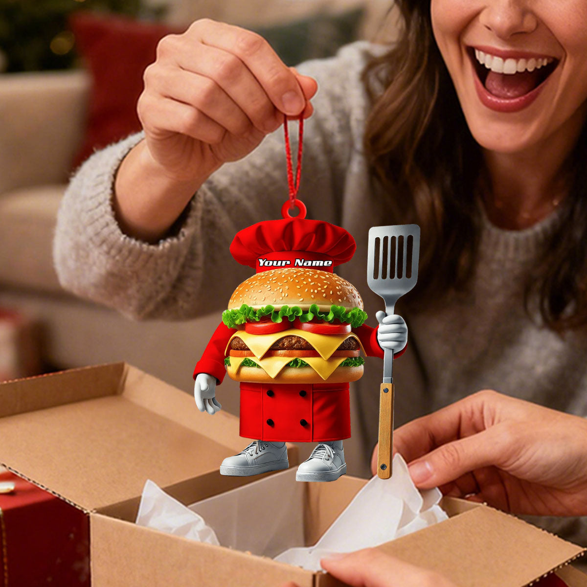 What makes it extra special? You can customize it with a name – whether it’s your own, a loved one’s, or a fun nickname – making it a one-of-a-kind keepsake or gift. Hang it proudly and let it remind you of the joy of cooking, sharing meals, and celebrating the most wonderful time of the year! 🍔❤️🎁