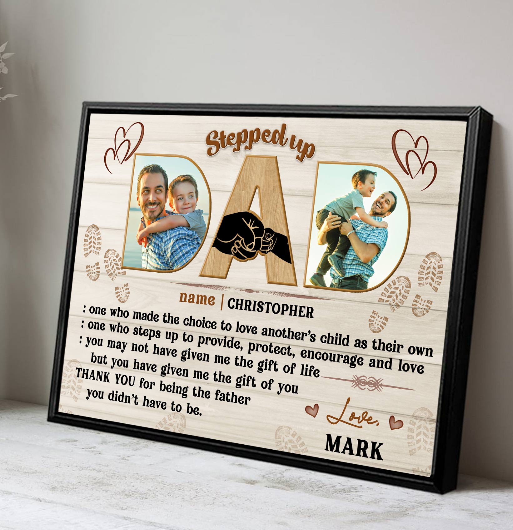 Celebrate the special bond between a stepfather and his stepchild with our personalized "Stepped Up Dad" canvas. Show your appreciation and love with this beautiful piece of wall art. This personalized canvas print is the perfect Father's Day gift for your husband. Showcase precious memories with this unique gift.