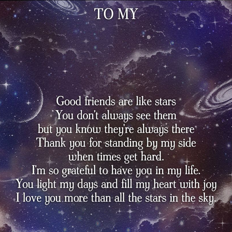 Good friends are like stars You don't always see them but you know theyre always there Thank you for standing by my side when times get hard. I'm so grateful to have you in my life. You light my days and fill my heart with joy I love you.more than all the stars in the sky.