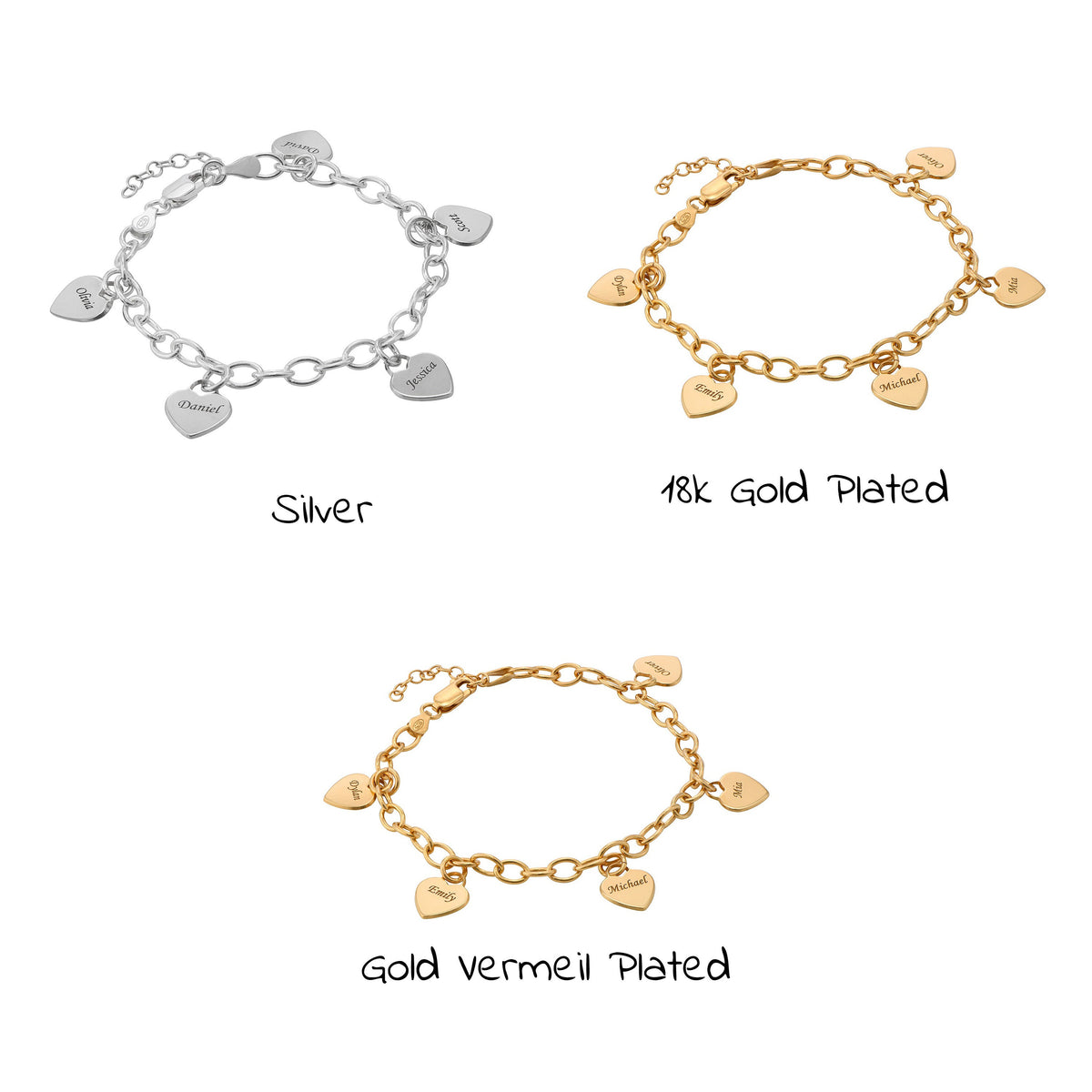 This sleek bracelet is adorned with open heart charms, each inscribed with the name=.