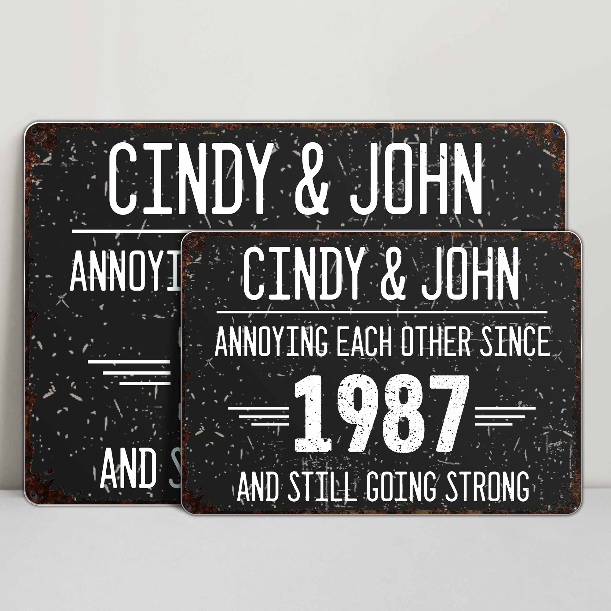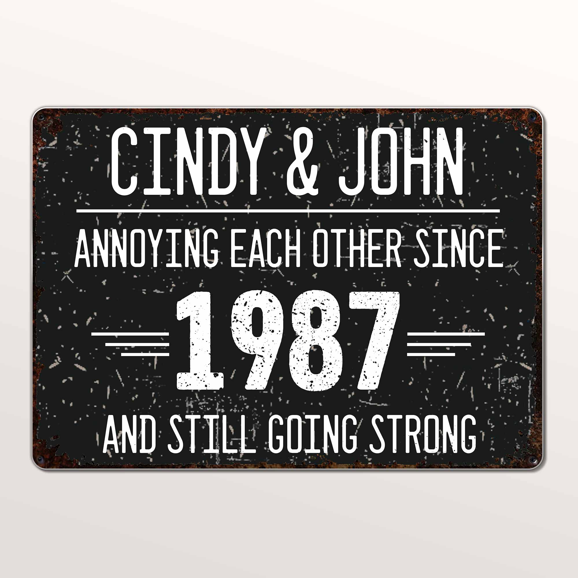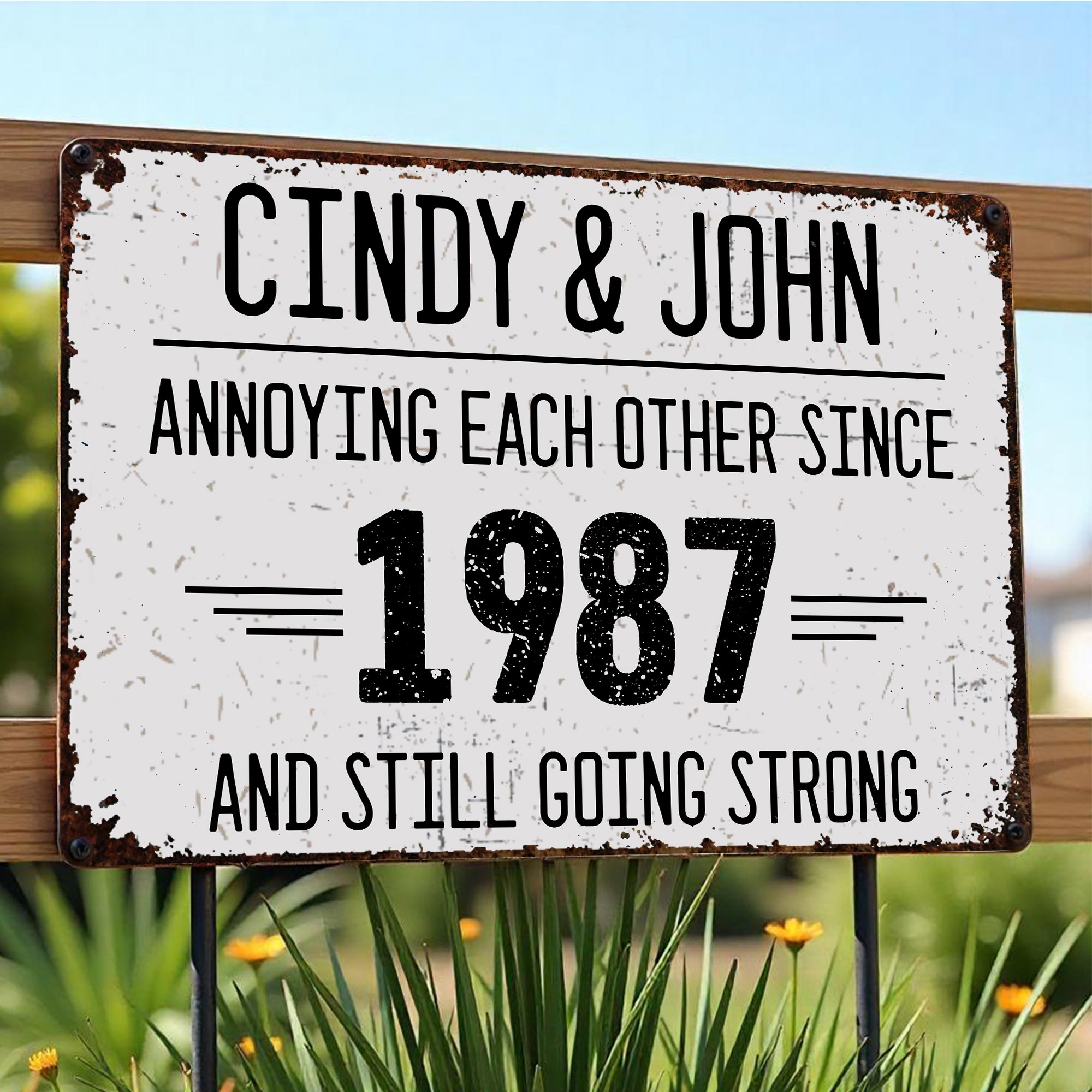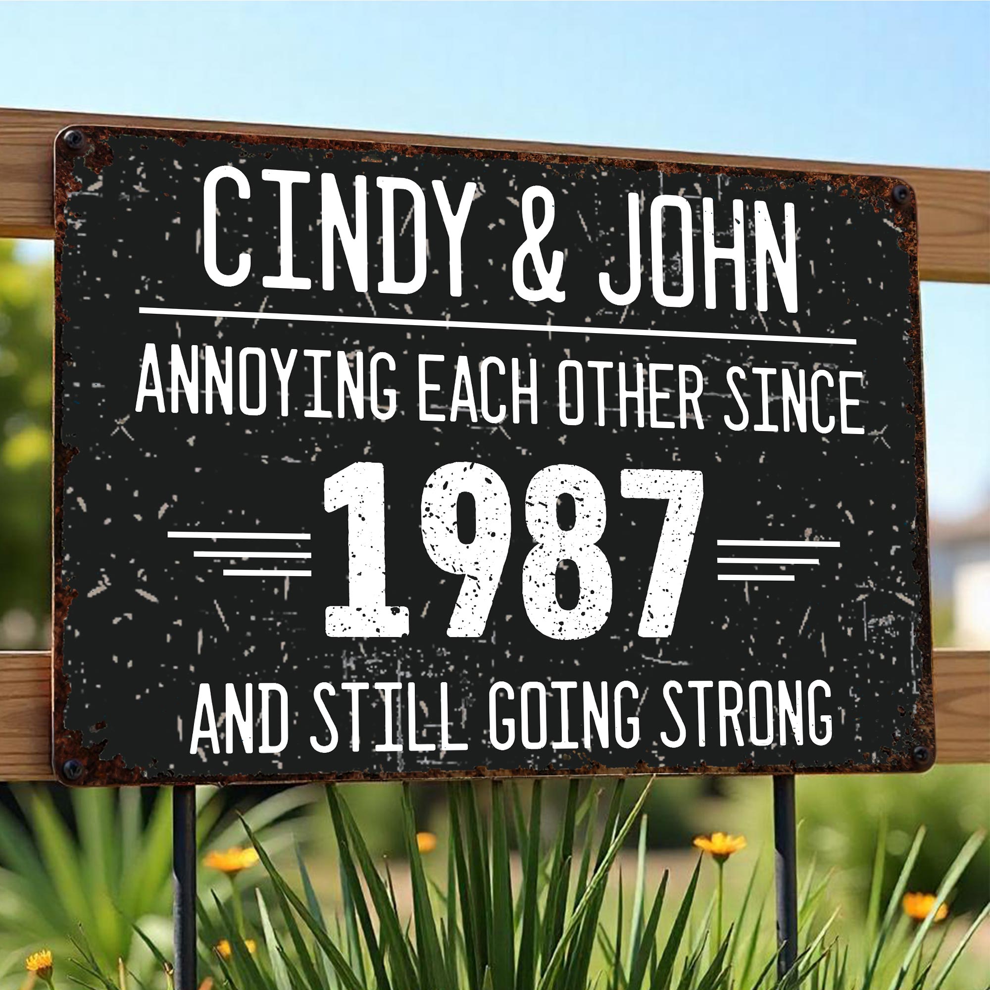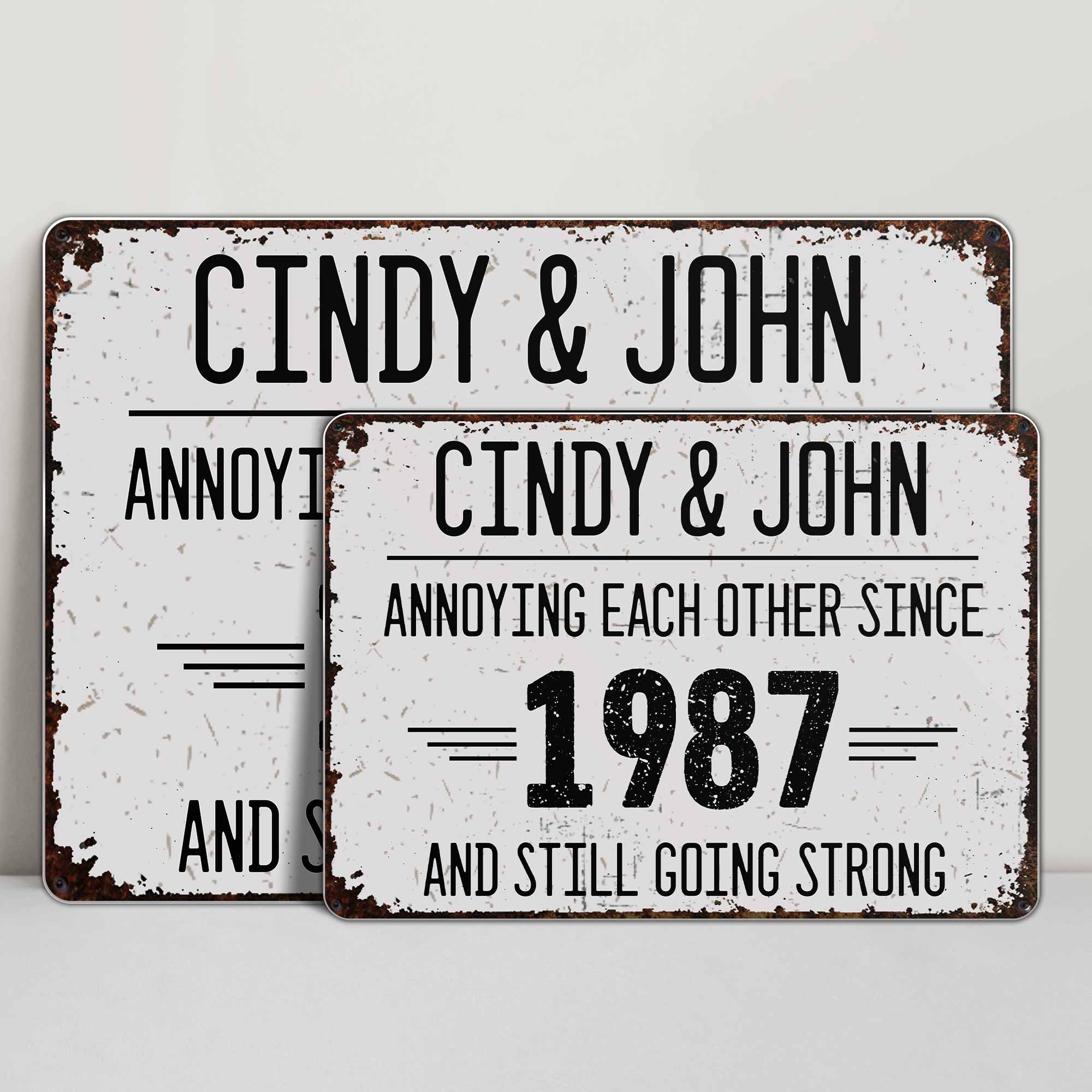 Celebrate enduring love with this personalized rustic metal sign, perfect for couples who have been "Annoying Each Other Since" a special year and are still going strong. Crafted with durable metal, it adds a charming, heartfelt touch to any home, reminding you both of the joy in your shared journey. This unique keepsake supports your lasting bond with a warm, personal message.
