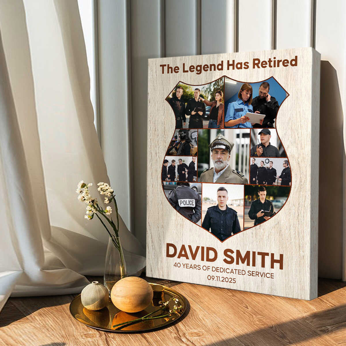 Commemorate their police career with a personalized badge-shaped photo collage canvas. A perfect way to celebrate their achievements and service.❤️❤️