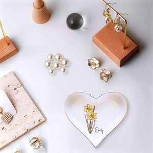 Personalized Ring Dish with a delicate depiction of your birth month flower and your name elegantly inscribed.Use it on a bedside table, vanity, or dresser to keep rings safe and stylishly displayed. Its delicate floral design and custom engraving ensure that it will be a cherished addition to her collection.